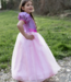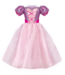 The skirt flows into a soft, rosy pink that’s perfect for twirling through gardens, castles, or make-believe adventures. Puffy sleeves add a classic princess touch, while a delicate white ruffled collar peeks up from the neckline, giving the dress a regal finish.
