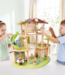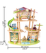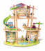 The 3-level playset is complete with a full set of furniture and accessories – four panda figurines, two hammocks, a sun umbrella, two-floor mats, a fireplace, bed, dresser, sofa, coffee table, kitchen table with two stump seats, stove, two plates, two cups, a pan, an elevator basket on a string, suspension bridge, rope ladder and a slide.