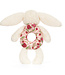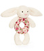A treat for tiny hands, Blossom Cream Bunny ‘Berry’ Ring Rattle can be grabbed by its soft paws, long lop ears or ring-shaped tummy. When given a gentle shake it will sound the rattle inside, much to baby’s delight! Crafted in a cream colored fur made from recycled fibers with a strawberry patterned tummy in an original Jellycat design, featuring a Bashful Bunny pink suedette nose and embroidery eyes.
